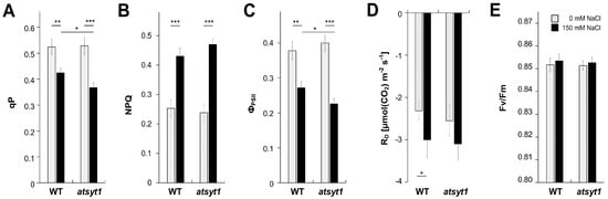 Dark respiration (RD) and chlorophyll a fluorescence parameters in leaves of wild-type (WT) and atsyt1 plants irrigated with tap water and 150 mM NaCl under constant 750 µmol m−2 s−1 photosynthetic photon flux density (PPFD). (A) Coefficients for photochemical quenching (qP). (B) Coefficients for non-photochemical quenching (NPQ). (C) Effective photochemical quantum yields of photosystem II (ΦPSII). (D) Dark mitochondrial respiration (RD). (E) Maximal quantum yields of photosystem II (Fv/Fm). Asterisks denote significant differences between groups assessed by t-test (* p < 0.05, ** p < 0.01, *** p < 0.001). Data are shown as means ± SE (n = 8 for plants irrigated with water and n = 12 for plants irrigated with 150 mM salt).