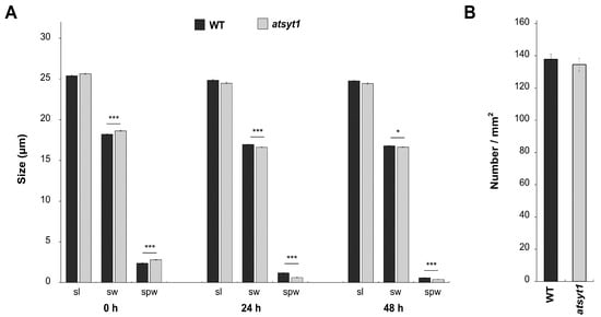 Effect of salt on stomata parameters in WT and atsyt1 plants. (A) Stomata length (sl), width (sw), and pore width (spw). (B) Densities of stomata. Asterisks denote significant differences between groups assessed by t-test (* p < 0.05, *** p < 0.001). Data are shown as means ± SE (n ≥ 500 in (A), n = 100 in (B)).