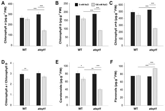Pigments contents in leaves of salt-stressed wild-type (WT) and atsyt1 plants. (A) Chlorophyll a. (B) Chlorophyll b. (C) Total amounts of chlorophylls. (D) Chlorophyll a to chlorophyll b ratio. (E) Carotenoids. (F) Flavonols. Asterisks denote significant differences between groups assessed by t-test (* p < 0.05, ** p < 0.01, *** p < 0.001). Data are shown as means ± SE (n = 45 in (A–E), n = 15 in (F)).