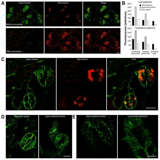 As we found that stomata react profoundly to NaCl treatment, we wished to verify if the distribution of AtSYT is also affected by salt in stomata guard cells. We examined cotyledons of 5-day-old AtSYT1-Dendra2 seedlings and leaves of 10-day-old AtSYT1-GFP seedlings growing in vitro. Using the equatorial optical section, we found that the signal emitted by AtSYT1-Dendra (cotyledons) and AtSYT1-GFP (leaves) was prominent in guard cells at their periphery and especially enriched at the junctions between the stoma guard cells (Figure 6A,B). Pavement cells’ peripheries showed lower signal intensities than guard cells (Figure 6B). The green signal was also observable inside the cells, especially around chloroplasts (Figure 6C). In a photoconvertible experiment, we also noted that the fluorescence signal surrounding the pore was an unspecific autofluorescence (Figure 6A). When we estimated the localization pattern of AtSYT1 on optical sections through the top and bottom of guard cells, we observed a densely punctate appearance that was distinguishable from adjacent cells in untreated plants (Figure 6D). In seedlings treated with 150 mM salt for 24 h, the signal in the upper periphery of guard cells shows the reticular shape. However, in the bottom section, we observed a densely punctate arrangement (Figure 6E).