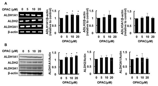 2.2. OPAC Enhanced the Protein and mRNA Levels of ALDH Isozymes