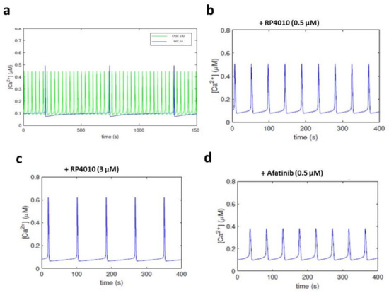 2+ oscillations was the focus to adjust the parameters, using experimental data from a single drug, either RP4010 or afatinib. Then the mathematical model successfully predicted the synergetic action when both drugs were included into consideration, suggesting that this mathematical simulation system could provide reliable evaluation on the anticancer effects of combined TKIs and SOCE blockers.