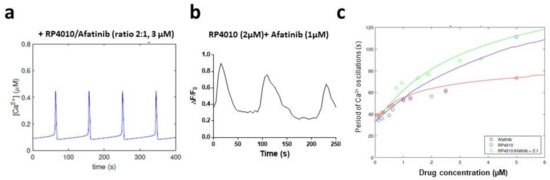 2+ oscillations in KYSE-150 cells responding to RP4010 and afatinib either individually or in combination. Both experimental and mathematical simulation data showed that a combination of afatinib and RP4010 could synergistically reduce the frequency of intracellular Ca