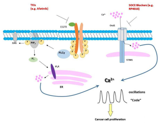 The anticancer function of TKI has been mainly studied in the aspect of inhibiting downstream PI3K/Akt and MEK/ERK pathways; however, its PLC-γ axis has received less attention. During the preparation of this article, Kim et al. reported that gefitinib, a first-generation reversible TKI, inhibits EGF-stimulated intracellular Ca