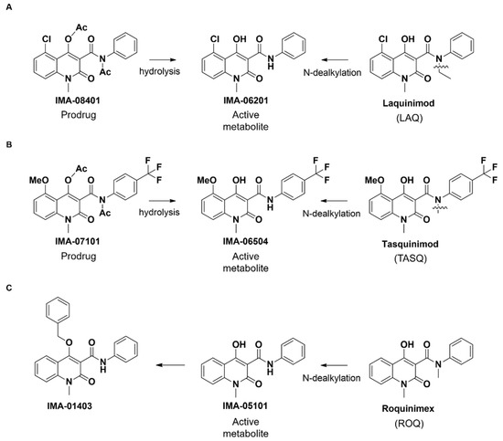 Structure of IMA-compounds. (A) Laquinimod (LAQ) is metabolized (N-dealkylation) to form the AHR-active metabolite IMA-06201. Hydrolysis of the prodrug IMA-08401 also forms the IMA-06201 derivative. (B) Tasquinimod (TASQ), its AHR-active metabolite IMA-06504, and the prodrug IMA-07101. (C) Roquinimex (ROQ), its AHR-active metabolite IMA-05101, and the 4-O-benzyl derivative IMA-01403.