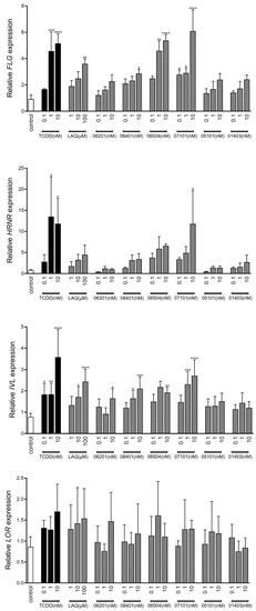 Human primary keratinocytes were cultured submerged in 24-well plates at 37 °C with 5% CO2 using keratinocyte growth medium with required growth factors and supplements (KGM, Lonza; without antibiotics) until confluency was reached [59]. Keratinocyte differentiation was initiated by depletion of growth factors and the cells were simultaneously stimulated with the IMA-compounds (10, 1, or 0.1 nM), TCDD (10, 1, or 0.1 nM), and LAQ (100, 10, or 1 µM). Keratinocytes were harvested after 48 h of stimulation (re-stimulated after 24 h) and processed for RNA isolation and subsequent qPCR analysis.