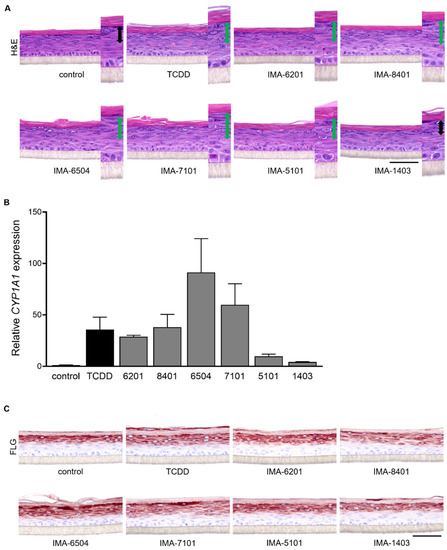Given the stimulating effects of coal tar, TCDD, and other AHR ligands on epidermal differentiation through AHR-dependent mechanisms [7,10,38,39], we analyzed the following marker levels for terminal differentiation: filaggrin (FLG), hornerin (HRNR), involucrin (IVL), and loricrin (LOR) (Figure 3). Stimulation with IMA-07101 significantly and dose-dependently induced FLG, HRNR, and IVL levels, similar to TCDD. Based on these results, we subjected organotypic human epidermal equivalents (HEEs) to 1 nM IMA exposure during the final 96 h of the air–liquid interface culture. In particular, the increase in numbers of stratum granulosum layers was most apparent after IMA-06504, IMA-07101, and IMA-08401 exposure (Figure 4A) and correlated to the levels of CYP1A1 expression (Figure 4B). We also observed epidermal thickening and induction of stratum corneum layers most notably after AHR activation via TCDD and the TASQ derivatives. FLG protein expression levels were most strongly induced by TASQ derivative IMA-06504 and its prodrug IMA-07101 (Figure 4C). This finding was further substantiated by loricrin (LOR) and involucrin (IVL) immunostainings of IMA-07101 exposed HEEs (Supplemental Figure S2A), and subsequent semi-quantitative analysis (Supplemental Figures S2B and S3). Thus, activation of AHR signaling by LAQ and TASQ derivatives resulted in similar stimulating effects on epidermal development and formation as previously described for coal tar [7].