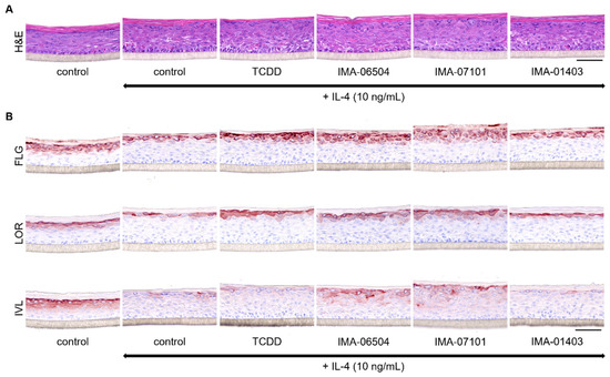 To generate an atopic dermatitis (AD)-like (AD-HEE) model [7,60,61,62], human primary FLG+/− keratinocytes (Supplemental Table S2) were used in combination with the disease-associated cytokine interleukin-4 (IL-4). AD-HEEs were first stimulated with IL-4 (10 ng/mL, Peprotech (supplemented with 0.05% bovine serum albumin, BSA, Sigma-Aldrich, St. Louis, MO, USA)) at day 4 of the ALI. After 24 h of disease initiation, HEEs were co-stimulated with the TASQ derivatives (IMA-06504 and IMA-07101), IMA-01403 and TCDD at a concentration of 1 nM and harvested 72 h later (re-stimulation after 48 h) for immunohistochemical analysis.