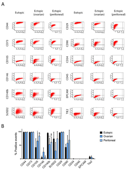 Expression of mesenchymal, hematopoietic, endometriotic, epithelial and endothelial markers by human eutopic and ectopic E-MSCs. Representative FACS analysis (A) and quantification (B) of eutopic and ectopic (both ovarian and peritoneal) E-MSCs lines for the expression of mesenchymal (CD44, CD73, CD90, CD29, CD105, CD146), hematopoietic (CD45, CD34), endometriotic (SUSD2, CD140b), epithelial (EPCAM) and endothelial (TIE2) markers. Analyses were performed on every cell line used in the study between passage 1 and 2. Data are shown as mean ± SD of all the tested lines: eutopic (n = 3), ovarian (n = 6) and peritoneal (n = 3) ectopic E-MSCs. P: p-value; * = p < 0.05, ** = p < 0.01 (ovarian vs. eutopic); $ = p < 0.05 (peritoneal vs. eutopic).