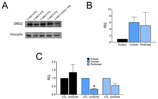 Effect of quinagolide on DRD2 expression in eutopic and ectopic E-MSCs. (A) Western blot analysis showing the presence of DRD2 in E-MSC lines, at different passages, and in sorted SUSD2+ E-MSCs. (B) Real-Time PCR analysis showing the relative quantification (RQ) of DRD2 mRNA expression by eutopic and ectopic E-MSCs. Data are represented as mean ± SD of three different eutopic or ectopic (ovarian and peritoneal) lines, and normalized to GAPDH and to eutopic E-MSCs. (C) Real-Time PCR analysis showing DRD2 mRNA expression after 48 h of 100 nM quinagolide treatment (Q100 nM) by eutopic and ectopic E-MSCs. Data are represented as mean ± SD of three different eutopic or ectopic (ovarian and peritoneal) lines, and normalized to GAPDH and to untreated E-MSCs (CTL). ANOVA was performed: * = p < 0.05 vs. CTL.