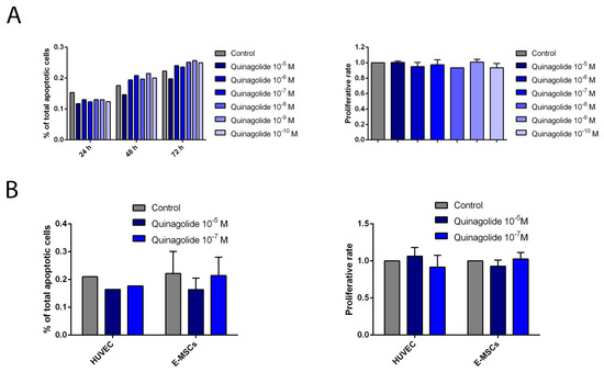 Quinagolide effect on E-MSC apoptosis and proliferation. (A) Quinagolide concentration-response curve on ectopic E-MSCs in both apoptosis (n = 1) and proliferation (n = 2) assays. (B) Effect of two selected quinagolide doses (10−5 and 10−7 M) on HUVECs (n = 1) and ectopic E-MSCs (n = 3) apoptosis and proliferation assays (n = 2). Data are represented as mean ± SD of the indicated number of experiments and normalized to untreated cells (Control).