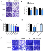 Quinagolide effect on E-MSC invasion. (A,B) Representative micrographs (A) and quantification (B) of quinagolide effect (100 nM) on eutopic and ectopic (both ovarian and peritoneal) E-MSC invasion (original magnification: X100). (C) Concentration response effect of quinagolide-treated ectopic E-MSC invasion. (D,E) Quantification (D) and representative micrographs (E) (original magnification: X100) of invasion assays performed on ectopic E-MSCs (both ovarian and peritoneal), treated with 100 nM quinagolide (Q100 nM), 5 µM spiperone (S) or a combination of quinagolide and spiperone (S + Q100 nM). All invasion data are represented as mean ± SD of at least three independent experiments, performed on different E-MSC lines, and normalized to untreated cells (CTL). One-way ANOVA was performed: * = p < 0.05 and ** = p < 0.001 vs. CTL.