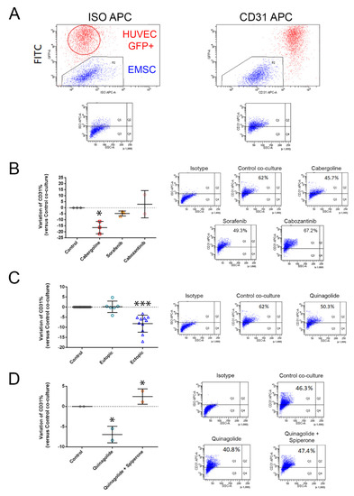 Quinagolide effect on E-MSC endothelial differentiation. (A) FACS gating strategy for the analysis of CD31+ E-MSCs after direct 48 h co-culture with HUVECs. E-MSCs are gated as GFP negative population, and CD31 expression is evaluated on the described gated E-MSCs after 48 h co-culture with HUVECs as percentage of CD31 APC positive events. (B–D) Representative flow cytometry micrographs and quantification, expressed as percentage of variation respect to control co-culture, of the effect of 24 h treatment of E-MSCs with 25 µM cabergoline, 1 µM sorafenib, 1 µM cabozantinib (B), 100 nM quinagolide (C) and the combination of 5 µM spiperone and 100 nM quinagolide (D) on E-MSC CD31 expression after 48 h of co-culture with HUVECs. Data are represented as mean ± SD of at least three independent experiments, performed on different ectopic E-MSC lines, and normalized to untreated co-culture. One-way ANOVA was performed: * = p < 0.05 and *** = p < 0.001 vs. control.