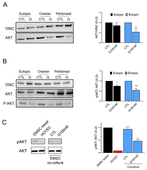 Quinagolide effect on AKT activation. (A): Representative western blot analysis and quantification of AKT levels in eutopic and ectopic E-MSCs treated for 48 h with 100 nM quinagolide (Q), compared to untreated cells (CTL). (B): Representative western blot analysis and quantification of P-AKT levels, normalized to AKT expression, in eutopic and ectopic E-MSCs treated for 48 h with 100 nM quinagolide (Q), with respect to untreated cells (CTL). (C): Representative western blot analysis and quantification of P-AKT levels in HUVECs, ectopic E-MSCs (E-MSC basal) and in E-MSCs after co-culture with HUVECs, treated or not for 24 h with 100 nM quinagolide (Q100 nM). Data are represented as mean ± SD of at least two independent experiments, performed on different E-MSC lines, and normalized to Vinculin and to untreated cells (CTL). One-way ANOVA was performed: * = p < 0.05 and ** = p < 0.001 vs. CTL.