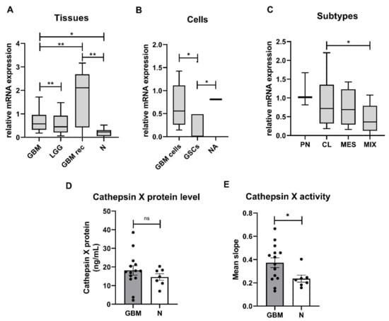 Expression of the cathepsin X gene was evaluated in low-grade gliomas (LGG), GBMs, and nontumor brain tissues as well as in primary GBM cells and GSCs established from GBM tissues. The highest relative mRNA expression of cathepsin X was measured in recurrent GBM, followed by de novo GBM and LGG tissues. The relative mRNA expression of cathepsin X was significantly lower in nontumor brain tissues compared to recurrent and de novo GBM tissues (Figure 1A). Cathepsin X was expressed in GBM cells and normal astrocytes and was higher than in GSCs (Figure 1B). Moreover, we analyzed mRNA levels of cathepsin X in the four GBM subtypes, MES, PN, CL, and mixed (MIX). This classification is based on the expression values of 12 subtype-specific genes according to Behnan et al. [], to which we added three more genes based on in-house gene expression analyses []. The PN subtype was classified by the expression levels of OLIG2, P2RX7, STMN4, SOX10, NOTCH, and ERBB3 genes. The CL subtype was classified by the expression levels of NF-KB, ACSBG1, S100A4, and KCNF1, the MES subtype—by the expression levels of DAB2, TGFB1, THBS1, COL1A2, and COL1A1. The cathepsin X gene was expressed in all GBM subtypes, but the lowest level was detected in the MIX subtype. Statistical significance was observed only for the relative mRNA expression of cathepsin X between the CL and MIX subtypes (Figure 1C). Cathepsin X median mRNA levels in our study of 48 GBM patients did not correlate with the overall survival of GBM patients (Figure S1). To confirm the differences at the protein level of cathepsin X and its enzymatic activity, proteins were isolated from the dissected GBM and nontumor brain tissues. ELISA revealed no significant difference in cathepsin X expression between the groups; however, we observed a trend towards increased protein level of cathepsin X in GBM (Figure 1D). On the other hand, significantly higher enzymatic activity of cathepsin X (Figure 1E) was detected in GBM tissues as compared to nontumor brain tissues.