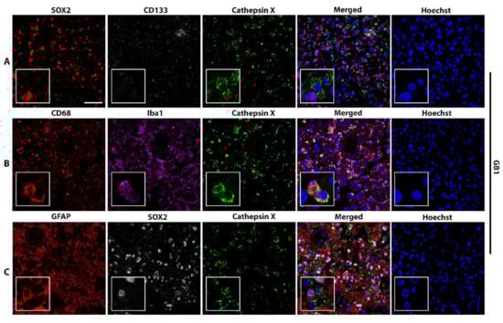 Localization of cathepsin X in CD68-positive and Iba-1-positive cells. Representative images of triple immunofluorescence staining of cathepsin X (green) and markers of (A) GSCs (SOX2—red, CD133—grey), (B) macrophages and microglia (CD68—red) and microglia (Iba1—purple), and (C) GBM cells and astrocytes (GFAP—red) and GSCs (SOX2—grey) are shown. The nuclei were counterstained with Hoechst 33258 (Hoechst, blue). Scale bar = 50 μm.