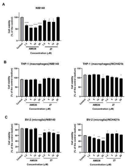 Effects of cathepsin X inhibitors AMS36 and Z7 on viability of GBM cells and GBM-associated cells. GBM cells NIB140 (A), differentiated macrophage THP-1 cells (B), and BV-2 microglial cells (C) exposed to the NIB140- and NCH421k-conditioned media were treated with cathepsin X inhibitors AMS36 and Z7 at various concentrations. Cell viability was then assessed using the MTS assay. The control means a DMSO solvent (0.25%). The control medium was a blank GBM cell/GSC medium without soluble molecules secreted from GBM cells/GSCs. The data are presented as the mean values SEM. * p < 0.05, ** p < 0.01, *** p < 0.001, and **** p < 0.0001.