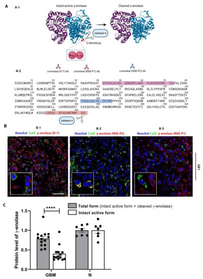 Colocalization of cathepsin X and γ-enolase in GBM tissues. (A) A structure of the γ-enolase dimer and cleavage of C-terminal amino acids by cathepsin X (A-1). Three different primary antibodies against γ-enolase were used: A γ-enolase (D-7) antibody specific for the epitope between amino acids 41–73 near the N-terminus (purple amino acid sequence), a γ-enolase (NSE-P2) antibody against the internal region (amino acids 271–285, blue amino acid sequence), and a γ-enolase (NSE-P1) antibody against amino acids 416–433 in the C-terminal region (red amino acid sequence) (A-2). Total γ-enolase was detected using the NSE-P2 antibody, whereas the intact active form was detected using the NSE-P1 antibody. (B) Double immunofluorescence staining for cathepsin X and γ-enolase. In Figure B-1 and Figure B-3, no or partial colocalization of cathepsin X and γ-enolase was observed. In Figure B-2, colocalization of both proteins was observed, suggesting that cathepsin X colocalizes mainly with cleaved γ-enolase. The cell nuclei were counterstained with Hoechst 33258 (Hoechst, blue). Scale bar = 50 μm. (C) Significantly lower levels of the intact active form of γ-enolase were observed in GBM tissues compared to the nontumor brain tissue control (N). Protein levels of both forms of γ-enolase in GBM and nontumor brain tissues were obtained by means of ELISA. The bars represent the means with individual values (n = 14 of GBM and n = 7 of nontumor tissue samples) ± SEM. **** p < 0.0001. Image A-1 was created with Mol*Viewer [] based on RCSB PDB (rcsb.org) ID 1TE6 [] and image A was created with BioRender.com.