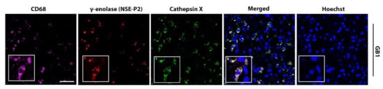 Colocalization of cathepsin X and γ-enolase in CD68-positive cells in GBM tissues. Representative images of triple immunofluorescence staining for cathepsin X (green), γ-enolase NSE-P2 (red), and marker of macrophages and microglia (CD68—purple) show overlapping expression of cathepsin X and γ-enolase NSE-P2 in the CD68-positive cells. The cell nuclei were counterstained with Hoechst 33258 (Hoechst, blue). Scale bar = 50 μm.