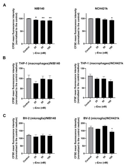 Effects of the γ-Eno peptide on proliferation of GBM cells, GSCs, and GBM-associated cells. GBM cells NIB140, GSCs NCH421k (A), as well as differentiated macrophage THP-1 cells (B) and BV-2 microglial cells (C) exposed to the NIB140- and NCH421k-conditioned media were treated with increasing concentrations of the γ-enolase peptide, C-terminal 30-amino-acid sequence of human brain γ-enolase (γ-Eno). Cell proliferation was evaluated using CFSE staining and flow cytometry. The control means a blank culture GBM cell/GSC medium without addition of γ-Eno (A). The control medium is a blank GBM cell/GSC medium without soluble molecules secreted from GBM cells/GSCs and without addition of γ-Eno (B,C). The data are presented as the means SEM. * p < 0.05, ** p < 0.01.