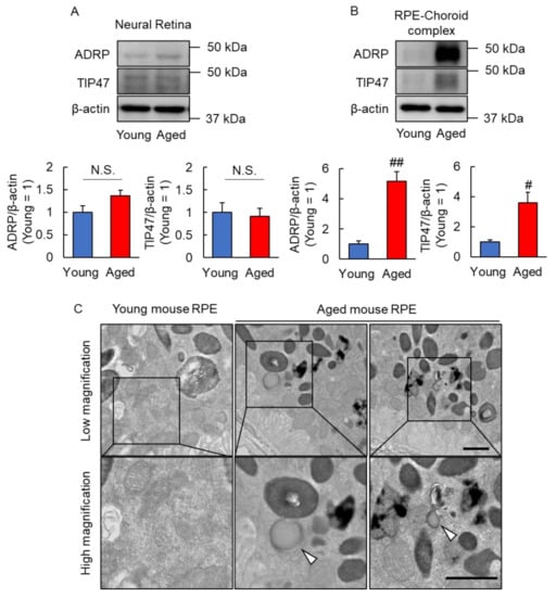 Changes in lipid droplet in the eye with age. (A,B) Expression levels of lipid droplet membrane proteins for young and aged mice in neural retina (A) and RPE-choroid complex (B). Data are the means ± standard error of means (SEMs) (n = 4 or 5 mice/group). ## p < 0.01, # p < 0.05 vs. young (Student’s t-test or Welch’s t-test). N.S.—No significant difference. (C) The representative transmission electron microscope (TEM) image of the RPE cell (n = 3 mice/group). Arrow head shows lipid droplet. Scale bar shows 1 µm.