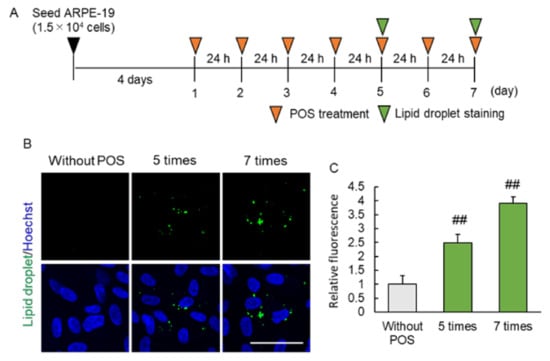 Lipid droplet accumulation via POS phagocytosis. (A) Experimental protocol of POS treatment induced lipid droplet accumulation. Green arrow head shows lipid droplet staining timepoint, and orange arrow head shows POS treatment timepoint. (B) The representative image of lipid droplet (green) and Hoechst 33,342 (blue) following continuous (5- and 7-times) POS treatment. Scale bar shows 50 µm. (C) The quantitative data of the fluorescence intensity of lipid droplet. Data are the means ± SEMs (n = 4 independent experiments). ## p < 0.01 vs. without POS group (Dunnett’s test).