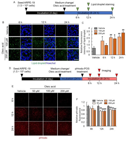 Decreased phagocytosis associated with lipid droplet accumulation. (A) Experimental protocol. Green arrow heads show lipid droplet staining timepoint (6, 12 and 24 h after oleic acid treatment). (B) The representative image of lipid droplet (green) and Hoechst 33,342 (blue) following 100 and 200 µM oleic acid treatment for 6–24 h. Scale bar shows 50 µm. (C) The quantitative data of fluorescence intensity of lipid droplet. Data are the means ± SEMs (n = 4 or 5 independent experiments). ## p < 0.01, # p < 0.05 vs. vehicle (Dunnett’s test). (D) Experimental protocol of phagocytosis assay after oleic acid treatment. Red arrow heads show the imaging timepoint (6, 12 and 24 h after pHrodo-POS treatment). (E) The representative image of phagocyted pHrodo-POS in ARPE-19 cells after 50 to 200 µM oleic acid treatment. Scale bar shows 100 µm. (F) The quantitative data of the pHrodo fluorescence intensity. Data are the means ± SEMs (n = 6 independent experiments). ## p < 0.01 vs. vehicle (Dunnett’s test).