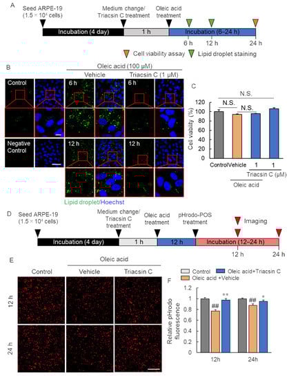 Improvement in phagocytosis by inhibition of lipid droplet accumulation. (A) Experimental protocol. Green arrow heads show lipid droplet staining timepoint (6 and 12 h after oleic acid treatment), and orange arrow head shows cell viability assay timepoint (24 h after oleic acid treatment). (B) The representative image of lipid droplet (green) and Hoechst 33342 (blue) following triacsin C and oleic acid treatment. Scale bar shows 10 µm (magnified image) or 50 µm. (C) The quantitative data of cell viability after triacsin C and oleic acid treatment. (D) Experimental protocol of phagocytosis assay after triacsin C and oleic acid treatment. Red arrow heads show the imaging timepoint (12 and 24 h after pHrodo-POS treatment). (E) The representative image of phagocyted pHrodo-POS in ARPE-19 cells after triacsin C and oleic acid treatment. Scale bar shows 100 µm. (F) The quantitative data of the pHrodo fluorescence intensity. Data are the means ± SEMs (n = 6 independent experiments). ## p < 0.01 vs. control, ** p < 0.01, * p < 0.05 vs. Oleic acid + vehicle (Tukey’s test). N.S.—No significant difference.