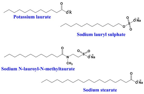 In this type of surfactants, the hydrophilic group has a negative charge on the polar head, such as carboxylate (RCOO−), sulphonate (RSO3−), or sulphate (RO-SO3−) []. When these surfactants dissolve in water, negatively charged particles (anions) are created. Anionic surfactants are widely used for industrial as well as household cleaning and for pesticide formulations;for example, potassium laurate, sodium lauryl sulphate, sodium decyl sulfate, sodium N-lauroyl-N-methyltaurate, sodium tetradecyl sulphate, sodium stearate, α-olefin sulfonate, etc. (Figure 2).