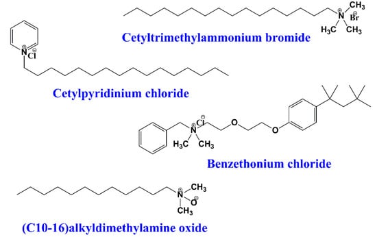 These surfactants possess a positive charge on the polar head, which may be either permanent or only exist in a range of pH values. The cationic surfactants can dissociate in water with the formation of surface-active cations []. One of the advantages of the cationic surfactants is the diversity of their head groups, which permits the chemical modification and introduction of desirable moieties. In addition, these surfactants have compatibility with both non-ionic and amphoteric surfactants and incompatibility with the ionic ones. Usually, cationic surfactants are found in fabric softener formulations, antistatic agents, particle dispersants, corrosion inhibitors, and emulsifiers [,]. Cationic surfactants also have found important application in pharmacy and biomedicine as drug nanocarriers [,,]; for example, cetyltrimethylammonium bromide, cetylpyridinium chloride, and alkyldimethyl amine oxides (Figure 3).