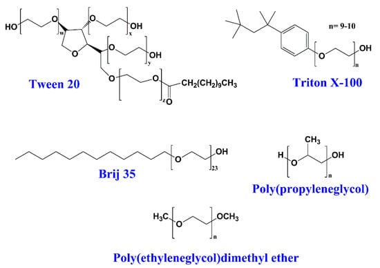 The non-ionic surfactants have polar head groups that are not electrically charged. In general, the solubility of non-ionic surfactants in water is not good compared with the solubility of ionic surfactants; however, they do not change the pH of the solution. Usually, these surfactants show a better biocompatibility than ionic ones, making them suitable for biomedical applications [,,,]. The non-ionic surfactants are also the most used in the food industry [,,]. Typical non-ionic surfactants are Tween 20, Tween 80, Triton X-100, Brij-35, and alkylethers of poly(ethylene glycol) and poly(propylene glycol) (Figure 4).
