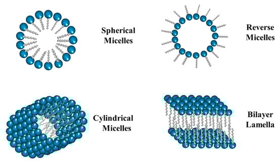 Micelles are commonly defined as core-shell surfactant-based systems dispersed in a bulk phase. Surfactants can spontaneously create these nanometric systems in either an aqueous or oily phase. The micelles formed in aqueous solution are called conventional (or normal) while those formed in an oily bulk phase are called reverse (or inverse). In the conventional micelles, the shell is bordered by the hydrophilic region of the surfactant molecules, while the hydrophobic one forms the core (Figure 6). Micelles can be spherical, cylindrical, or organized in multi-layered flat sheets. In addition, the morphology of the micelles can be tuned by varying some parameters, including the size and type of the hydrophobic tail of the surfactant, the nature and size of the polar head, as well as the concentration, temperature, pH, etc. [,,].