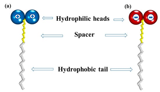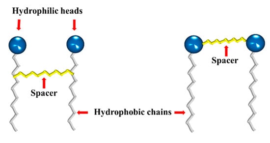 Gemini surfactants are dimeric structures, composed of two hydrophobic chains and two hydrophilic heads, linked by a spacer at or near the head groups (Figure 7). They present lower CMC, better efficiency to form micelles, and solubilization capacity comparedto their conventional (monomeric) counterparts [,,]. They can also reduce the surface tension of water and the oil–water interfacial tension from 10 to 100 times. This behavior depends mainly on the nature of their components (heads, hydrophobic chains and spacer); thus, their synthesis is focused mainly on varying the type and length of these components.