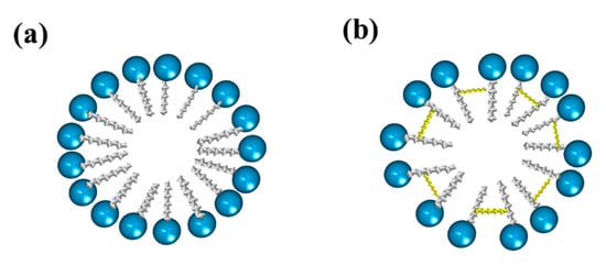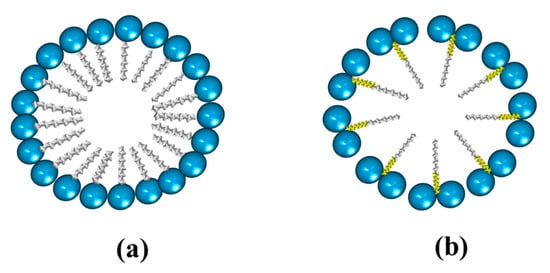 Gemini surfactants have attracted interest among the scientific community in various applications due to their very low CMC, greater solubilization power, as well as better wetting and foaming properties compared to single-chain surfactants []. Gemini surfactants have a polymorphic phase behavior and a great variety of self-assembled structures forming aggregates that can be observed as micelles, bilayers, and vesicles, depending on the head groups, the size of the hydrophobic tails, and the nature of the spacer []. Figure 8 shows the structure of normal micelles obtained from conventional and gemini surfactants.