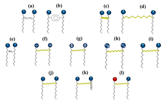 On the other hand, the groups present in the spacer can be classified into polar (Figure 9e) or nonpolar (aliphatic and aromatic groups). Furthermore, the polar head can be positive, negative, zwitterionic, or non-ionic (Figure 9f–i). Finally, gemini dissymmetric (heterogeminis) surfactants contain two groups of non-identical polar heads (or identical) and different (or identical) lengths of alkyl tails, so they can also be classified into gemini surfactants of different head or hydrophobic tails and gemini surfactants of identical head and hydrophobic tails (Figure 9j–l) [].