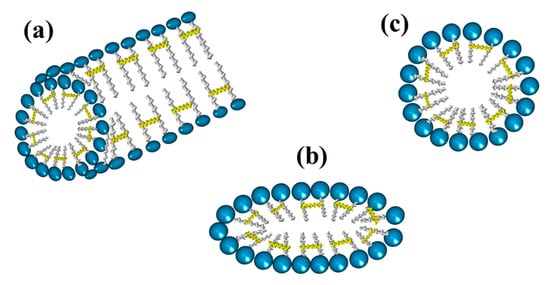 In addition, there are studies on the influence of some parameters, such as the concentration, pH, temperature, and the presence of salts, on the morphology of aggregates formed by cationic gemini surfactants. These studies have shown a change from micelles to vesicles and vice versa by varying either the pH or temperature. Furthermore, the presence of salts may cause a transition from vesicles to micelles (Figure 15) [].