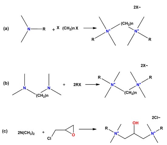 There are three main routes to synthesize symmetric gemini surfactants (Figure 11): (a) reaction of long chain tertiary amines with dihalogenated substrates as organic dibromides or dichlorides; (b) reaction of N,N,N′,N′-tetramethylpolymethylene diamines with alkyl halides; and (c) reaction of long chain tertiary amines with a haloalkylene oxide substrate.