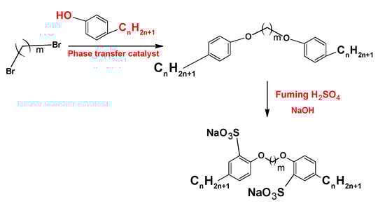 On the other hand, the synthesis and characterization of the anionic sulfonate gemini surfactants (Figure 13) with different hydrophobic chain length shows that this kind of surfactant presentsa lower density, viscosity, and CMC than sodium dodecylbenzene sulfonate (SDBS), a monomeric surfactant with twelve carbon atoms in the hydrophobic chain [].