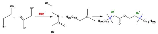 Micellar catalysis using gemini surfactants was shown to have high catalytic efficiency and accelerates processes reducing the generation of secondary reactions [,]. Bunton et al. proposed for the first time the use of gemini surfactants in micellar catalysis []. The gemini surfactant synthesized by this group showed a better catalytic efficiency than CTAB in nucleophilic substitutions reactions. Since then, morestudies have been reported [,,,]. Micellar catalysis using gemini surfactants has been applied in reactions of ester hydrolysis [], chloromethylation [], and nucleophilic and electrophilic substitutions []. Furthermore, the catalytic properties of these surfactants have favored the development of aqueous micellar catalytic processes, where the substitution of organic solvents for water is achieved, contributing to the development of more sustainable and environmentally friendly processes [].