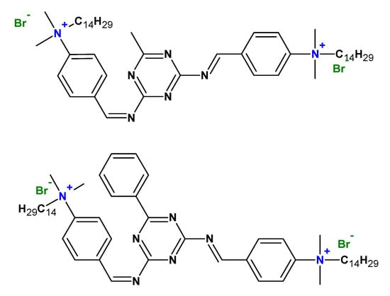 - Roszak, K.Z.; Torcivia, S.L.; Hamill, K.M.; Hill, A.R.; Radloff, K.R.; Crizer, D.; Middleton, A.M.; Caran, K. Biscationic bicephalic (double-headed) amphiphiles with an aromatic spacer and a single hydrophobic tail. J. Colloid Interface Sci. 2009, 331, 560–564. [Google Scholar] [CrossRef] [PubMed]