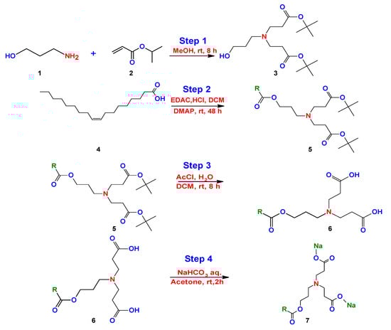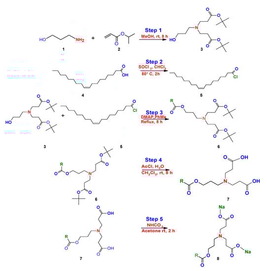 - Kalhapure, R.S.; Akamanchi, K.G. Synthesis, characterization and cytotoxicity evaluation of an oleic acid derived novel bicephalous dianionic surfactant. J. Surfactant Deterg. 2015, 18, 537–545. [Google Scholar] [CrossRef]