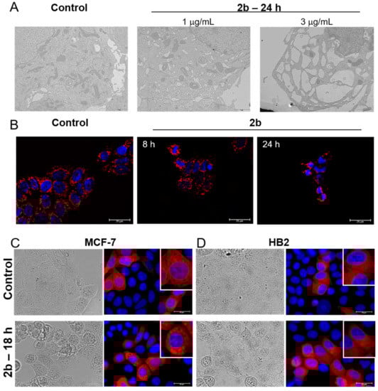 Our previous work demonstrated that UA derivative 2b induced massive cytoplasmic vacuolization (Figure 1A), which was partly reversed by dynasore, an inhibitor of dynamin []. To get further insight into the nature of vacuoles, whose size and number increased with the time of exposure to the compound, we visualized mitochondria using MitoTracker Orange and the ER by transfection with CellLight™ ER-RFP, which is a fusion construct of the ER signal sequence of calreticulin, KDEL (ER retention signal) and TagRFP. The morphology of the mitochondria of MCF-7 breast cancer cells was moderately affected by 2b. They became shorter and rounder than in control cells, especially after 24 h of treatment with 3 μg/mL 2b (Figure 1B), which is also evident in the TEM pictures (Figure 1A). Interestingly, the 2b derivative had a pronounced effect on ER morphology. The ER became larger, which was clearly seen after 18 h of exposure to the tested compound. The TagRFP signal colocalized with the large vacuoles seen in the light microscope images (Figure 1C). This indicated that the large vacuoles in 2b-treated cells are derived from the ER. Importantly, HB2 normal breast cells treated with 2b at a concentration of 3 μg/mL possessed an ER morphology similar to the control cells (Figure 1D), and their viability was not much affected by 2b at this concentration (data not shown), which is in line with the lower sensitivity of normal cells to 2b compared with cancer cells (IC50 = 1.3 μg/mL for MCF-7 and about 9 μg/mL for HB2 after 24 h of treatment).