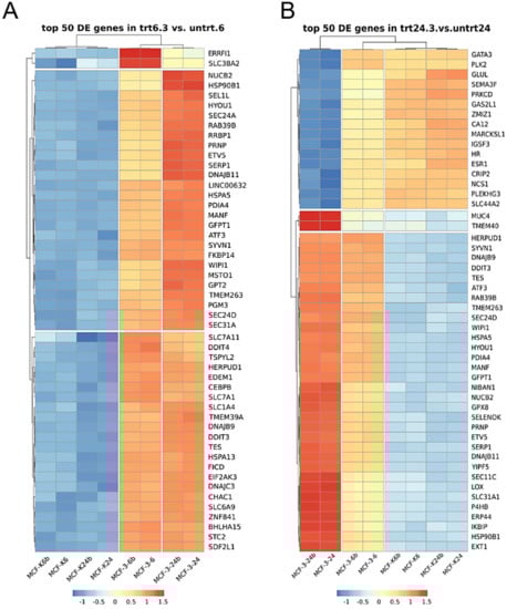 2b induces ER stress in breast cancer cells. Heat maps of the top 50 differentially expressed genes in MCF-7 cells treated with 3 μg/mL of 2b for 6 (A) or 24 h (B).