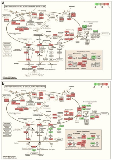 Changes in differentially expressed genes of KEGG pathway related to protein processing in ER after 6-h (A) or 24-h (B) treatment with 2b compared with control cells. Downregulated genes appear in green and upregulated genes appear in red.
