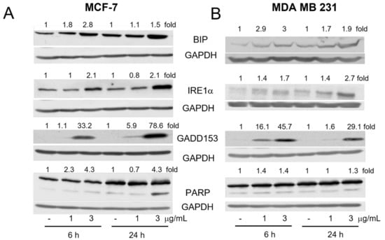 2b induces ER stress in breast cancer cells. Immunoblots for ER stress markers, BIP, IRE1α, GADD153 as well as PARP in MCF-7 (A) or MDA MB 231 cells (B) treated with DMSO or 2b (1 or 3 μg/mL) for 6 or 24 h. The blots were stripped and reprobed with the anti-GAPDH antibody to ensure equal protein loading. Densitometric scanning data after correction for loading control are above the immunoreactive bands (in the case of PARP quantification of faster migrating, cleaved fragments are shown).