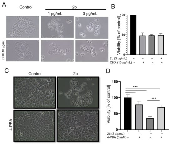 As the ER stress is caused by an overload of the ER lumen with improperly folded proteins, which might lead to ER dilatation, we used cycloheximide to abrogate protein synthesis. As shown in Figure 5A, pretreatment with cycloheximide protected against vacuolization and cell morphology changes induced by 2b after the 24-h exposure. This may also suggest that protein synthesis is necessary for vacuolization, which is one of the features of paraptosis. We did not observe protection against a 2b-induced drop in viability by cycloheximide; however, it is worth noting that cycloheximide by itself significantly decreased MCF-7 cell viability and did not enhance the cytotoxicity of 2b (Figure 5B). Importantly, 4-phenylbutyric acid (4-PBA), a small molecular chemical chaperone that prevents protein aggregation and alleviates ER stress-mediated cell damage [], protected against 2b-induced vacuolization and drop in cell viability (Figure 5C,D).