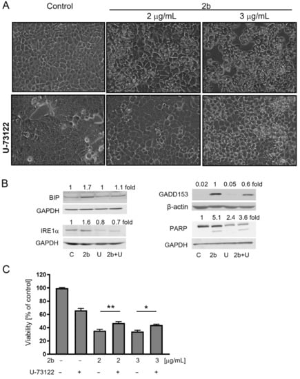 Inhibition of PLC protects against 2b-induced ER stress and partially—against 2b-induced cell death. MCF-7 cells were pretreated or not with U73122 (5 μM) for 1 h and then treated with 2b at indicated concentrations. (A) Cell morphology was inspected after 24-h treatment using light microscopy (magnification 20×). (B) The levels of ER stress markers were estimated after 6 or 24-h treatment with 2b (3 μg/mL) by immunoblotting. The blots were stripped and reprobed with an anti-GAPDH antibody to ensure equal protein loading. Densitometric scanning data after correction for loading control are above the immunoreactive bands. (C) Viability of cells was evaluated by MTT assay after 24-h treatment with 2b. The data are shown as the mean ± SE. Statistical significance was determined by one-way ANOVA followed by Tukey’s multiple comparison test: * p < 0.05, ** p < 0.01.