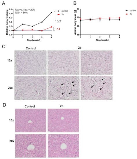 Results presented in this work and our previously published data [] indicate that 2b is a more potent antiproliferative agent against cancer cells, including MCF-7 breast cancer cells, than UA, and at the same time is quite safe for normal cells. To elucidate if 2b retains these features in vivo we tested it in mice models. First, the acute toxicology tests based on the oral administration have been performed using laboratory strain BALB/c mice which allowed a determination of the Maximum Tolerated Doses (MTD). MTD for UA (used as a positive control) was 200 mg/kg and for 2b—400 mg/kg, which indicates that 2b is less toxic to animals than UA (data not shown). Next, the effect of 2b on the growth of MCF-7 xenograft in nude mice has been tested. As shown in Figure 8A, orally administered 2b inhibited tumor growth and this was a cytostatic effect (ΔT ≥ 0). The percent tumor growth unaffected by treatment was calculated as 20% (%Gr) and inhibited by 2b—as 80% (%GrI). The tested derivative did not affect body mass (Figure 8B). Similarly to in vitro cell culture, 2b induced vacuolization of MCF-7 cells in tumor cells (Figure 8C). Importantly, vacuolization was not observed in livers either of control or 2b-treated animals (Figure 8D).