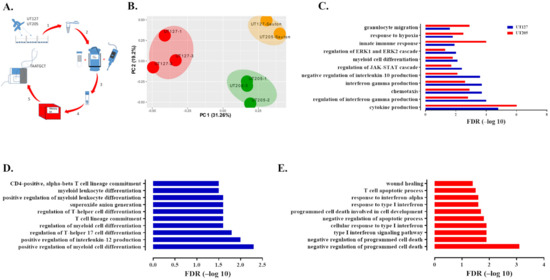 UT127 and UT205 clinical isolates of Mtb trigger a distinct transcriptomic response in human splenic macrophages upon infection. (A) General outline of the dual RNA-seq strategy. 5–20 × 106 human splenic macrophages (hSMs) were infected for 6 h at an MOI of 10:1 with the two closely related clinical strains of the Latin American and Mediterranean (LAM) family of Mtb, UT127, and UT205. Upon total RNA-recovery, samples were RNA-seq sequenced and reads mapped to the human and Mtb genomes (see Section 4). (B) Principal component analysis (PCA) of Mtb transcriptome cluster gene expression of UT127 from UT205 inside infected hSMs. Differentially expressed genes for UT127 and UT205 were obtained by comparing the same strains cultured in a carbon-poor medium (Sauton’s). (C–E) Deduced functional categories using the GO-seq algorithm on the immune genes obtained from the ImmPORT database. (see Section 4). Infection of hSMs with UT127 was associated with 645 over-represented biological processes, while infection with UT205 was associated with 585 over-represented processes. (C) Illustrates selected common biological processes differentiating the hSM response to UT127 and UT205. (D,E) Selected unique immune biological processes over-represented in response to UT127 (D) or UT205 infection (E). Blue and red bars represent biological processes (C–E) associated with the hSMs transcriptional response to Mtb UT127 or UT205.