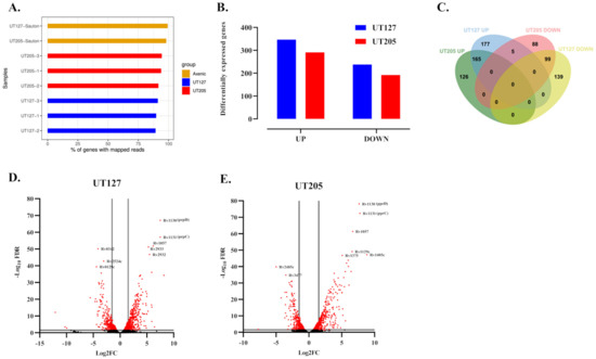 Gene expression response of UT127 and UT205 Mtb strains to hSMs adapt to hSMs by expressing distinct transcriptomic profiles. (A) Bar graph displaying the percentage of genome coverage of the reads obtained from intracellular Mtb. Reads from intracellular Mtb UT127 and UT205 of each triplicate sample were mapped to the Mtb H37Rv genome (see Section 4). Reads mapped to 80–90% of the Mtb genome, depending on the sample. (B) Bar chart indicating the amount of differentially expressed genes (DEGs) for each condition. (C) Venn diagram displaying the sharing of differentially expressed up-regulated and downregulated genes of Mtb UT127 and UT205 in infected hSMs. (D,E) Volcano plots of the genes expressed by Mtb strain UT127 (D) and UT205 (E) within 6 h of infection of human splenic macrophages. Macrophages were infected for 6 h with an MOI of 10:1. Differentially expressed genes were selected with 1.5 Log2FC, p < 0.05, FDR < 0.05. Grey lines discriminate differentially expressed genes (DEGs). The most highly up-regulated and downregulated genes are shown.